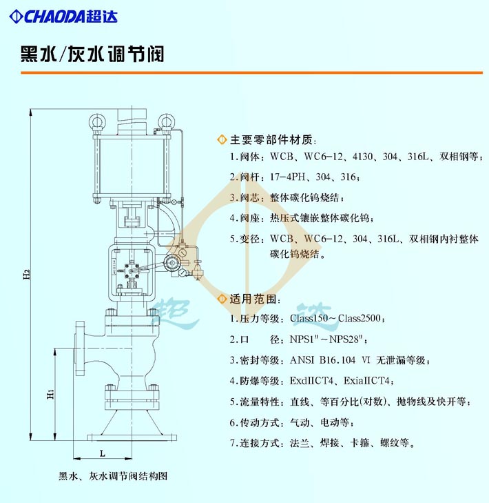 黑水灰水調(diào)節(jié)閥適用于DN25~DN700、Class150~Class2500的各種管路上,用于截?cái)嗷蚪油ü苈分械慕橘|(zhì)。選用不同的材質(zhì),超達(dá)集團(tuán)的黑水灰水調(diào)節(jié)閥可分別適用于水、蒸汽、油品、硝酸、醋酸、氧化性介質(zhì)、尿素等多種介質(zhì)。黑水灰水調(diào)節(jié)閥的驅(qū)動(dòng)方式為氣動(dòng)或電動(dòng)。黑水灰水調(diào)節(jié)閥一般采用法蘭連接,也可采用對(duì)焊連接。