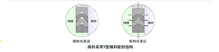 閥桿采用V型填料密封結(jié)構(gòu),V形填料能將填料壓蓋的壓緊力及介質(zhì)力有效地轉(zhuǎn)化成閥桿的密封力。