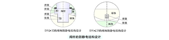根據(jù)用戶要求,球閥可以設(shè)有防靜電結(jié)構(gòu)。采用彈簧-鋼球(或柱塞)靜電引出裝置,使球體與閥體之間直接形成靜電通道(對于DN≤25的球閥)或通過閥桿使球體與閥體之間形成靜電通道(對于DN≥32 的球閥)。從而可將球體與閥座開關(guān)過程中摩擦產(chǎn)生的靜電通過閥體引到大地,防止靜電火花可能引起的火災或爆炸等危險。