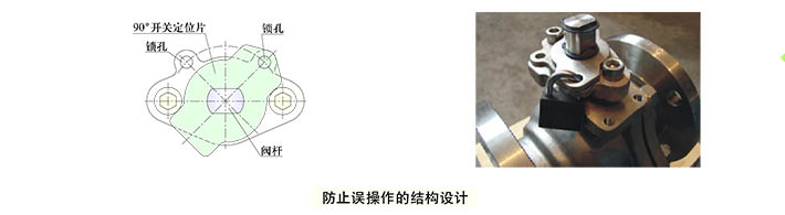 設(shè)置了帶鎖孔的90°開關(guān)定位片,根據(jù)需要可以加鎖,防止誤操作。閥桿頭部安裝手柄的部位采用扁形設(shè)計,當閥門開啟時,手柄與管道平行,當閥門關(guān)閉時,手柄與管道垂直,能夠確保閥門的開關(guān)指示不會發(fā)生錯誤。