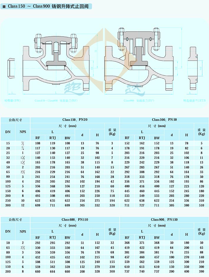升降式止回閥適用于Class150~Class900、PN20~PN150的各種管路上,阻止管路中的介質(zhì)倒流。選用不同的材質(zhì),超達(dá)集團(tuán)的升降式止回閥可分別適用于水、蒸汽、油品、硝酸、醋酸、氧化性介質(zhì)、尿素等多種介質(zhì)。升降式止回閥一般采用法蘭連接,也可采用對(duì)焊連接。