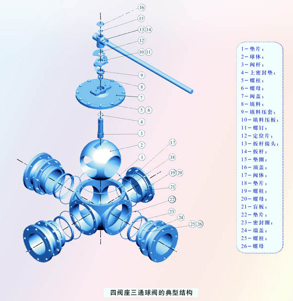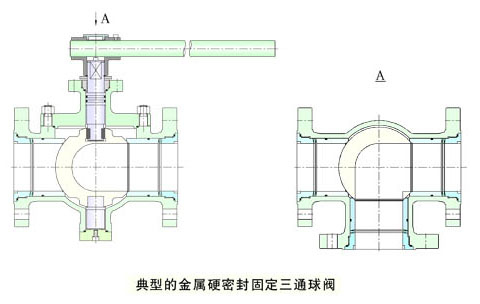 四閥座三通球閥采用頂裝式球體,由于采用四閥座結(jié)構(gòu),具有更好的密封性能,但包括球體在內(nèi)的閥門(mén)尺寸也相應(yīng)的增大,結(jié)構(gòu)也相對(duì)比較復(fù)雜。