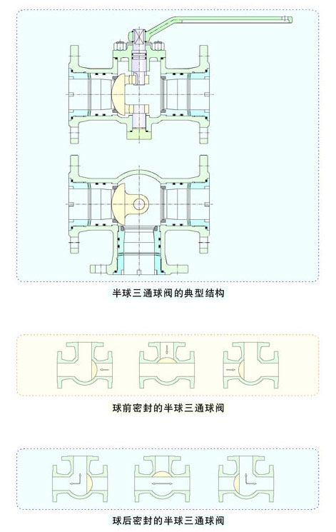 半球三通球閥采用固定球結(jié)構(gòu),結(jié)構(gòu)緊湊,中腔不會(huì)沉積介質(zhì)及污物,根據(jù)用戶使用要求的不同,可以設(shè)計(jì)成球前密封或球后密封。半球三通球閥可以采用軟密封結(jié)構(gòu)(密封圈材料可以是增強(qiáng)聚四氟乙烯、對(duì)位聚苯、尼龍、碳纖維等),也可采用金屬硬密封結(jié)構(gòu)。