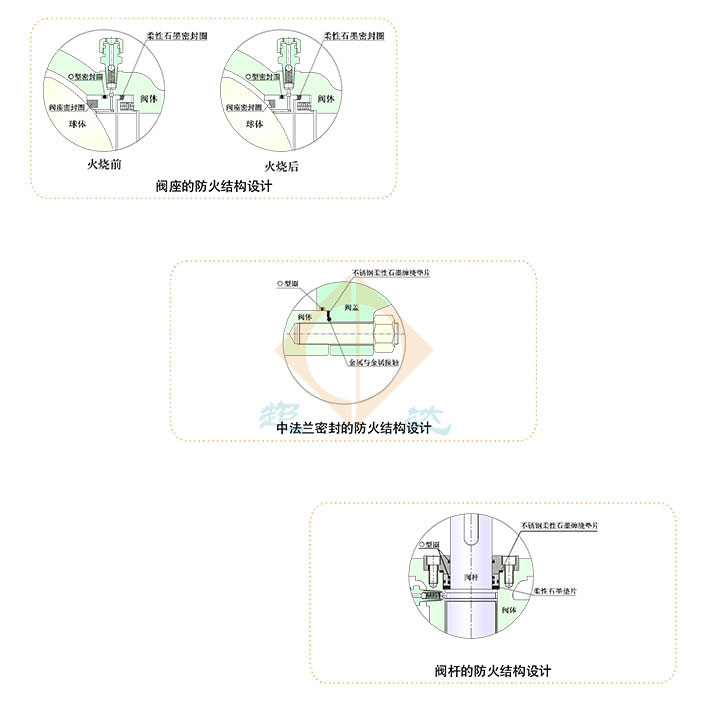 在法蘭連接固定球閥的使用現(xiàn)場發(fā)生火災時,當聚四氟乙烯、橡膠等非金屬材料制作的閥座密封圈、閥桿的O型密封圈以及中法蘭O型密封圈在高溫下?lián)p壞后,超達硬密封固定球閥能夠借助于特別設計的金屬對金屬輔助密封結(jié)構(gòu)或柔性石墨密封結(jié)構(gòu),有效地控制固定球閥的內(nèi)漏和外漏。對于用戶有防火要求的固定球閥,超達公司的防火結(jié)構(gòu)設計均符合API 607、API 6FA、BS 6755及JB/T 6899等標準規(guī)范的要求。