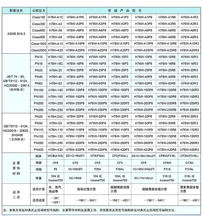 H76對夾旋啟止回閥簡單的理解就是被對夾在兩片法蘭之間的止回閥。H76對夾旋啟止回閥沒有螺栓孔,通過擰緊螺栓緊固法蘭達(dá)到固定止回閥的目的。一般情況下,選用H76對夾旋啟止回閥的比較多,因?yàn)?.對夾式便宜,法蘭的比較貴2.對夾式一般用于低壓,法蘭式可用于高中低壓3.對夾式一般安裝在兩法蘭之間,用作截?cái)嗷蛘哒{(diào)節(jié),法蘭式可以用作管道終端。