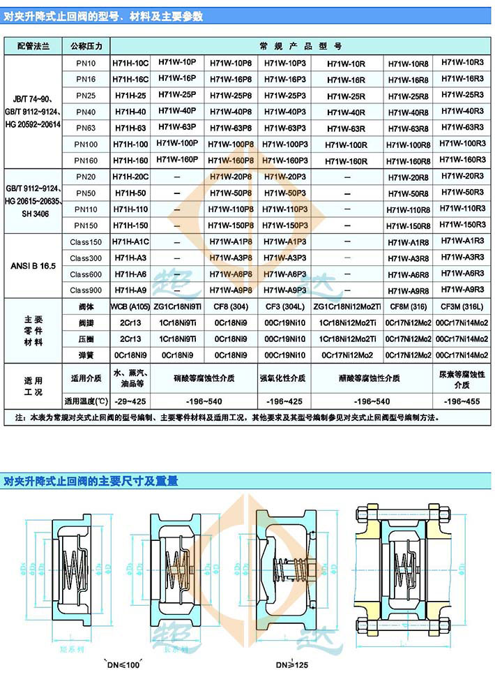 對夾升降止回閥屬于一種自動閥門,其主要作用是防止介質倒流、防止泵及驅動電動機反轉,以及容器介質的泄放。超達集團的對夾升降止回閥可分別適用于水、蒸汽、油品、硝酸、醋酸、氧化性介質、尿素等多種介質。對夾升降止回閥采用對夾連接。對夾升降止回閥類似于墊片一樣被對夾在兩片閥門之間,沒有螺栓孔,一般選擇對夾升降止回閥的比較多,對夾升降式止回閥便宜,適用于低壓。